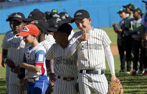 A young baseball player gives a thumbs up before the start of a baseball clinic, lead by MLB players in Havana, Cuba, Wednesday, Dec. 16, 2015. Los Angeles Dodgers outfielder Yasiel Puig, St. Louis Cardinals catcher Brayan Pena and Chicago White Sox first baseman Jose Abreu were among those who ran 10- and 11-year-old Cuban players through a skills camp on the second day of a three-day mission meant to warm relations between Major League Baseball and Cuba. (AP Photo/Ramon Espinosa)