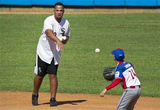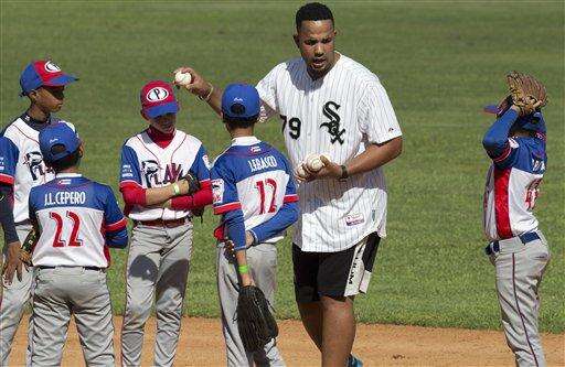 White Sox first baseman Jose Abreu, from Cuba, gives a baseball clinic to children in Havana, Cuba, Wednesday, Dec. 16, 2015. A group of Cuban-born baseball stars once disdained by the island's government for defecting to the United States taught their craft to some of the island's youngest players on Wednesday as part of a triumphant return to Cuba. (AP Photo/Ramon Espinosa)