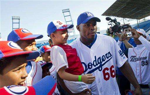Los Angeles Dodgers player Yasiel Puig, from Cuba, holds a young baseball player as he poses for photos before giving a baseball clinic to children in Havana, Cuba, Wednesday, Dec. 16, 2015. "We're going to give our best on this visit and we appreciate the opportunity we've been given," said Puig, who left Cuba on a smuggler's fast-boat in 2012. "Everything else we leave to God and destiny." (AP Photo/Ramon Espinosa)