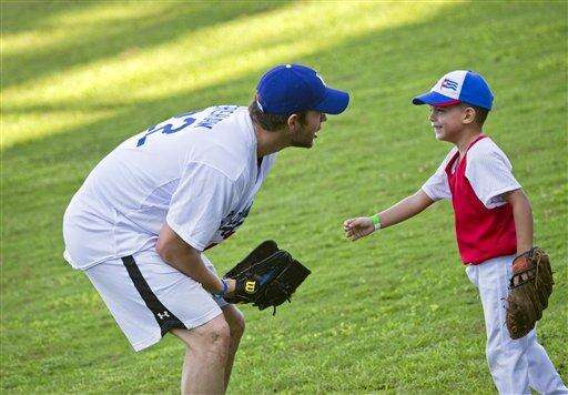 Los Angeles Dodgers pitcher Clayton Kershaw, from the U.S., speaks with a young baseball player during a MBL baseball clinic in Havana, Cuba, Wednesday, Dec. 16, 2015. The three-hour skills camp is part of a three-day mission meant to warm relations between Major League Baseball and Cuba. (AP Photo/Ramon Espinosa)