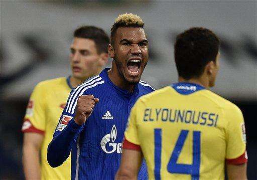 Schalke's Eric Maxim Choupo-Moting, center, celebrates after scoring the opening goal during the German Bundesliga soccer match between FC Schalke 04 and TSG Hoffenheim in Gelsenkirchen, Germany, Friday, Dec. 18, 2015. (AP Photo/Martin Meissner)