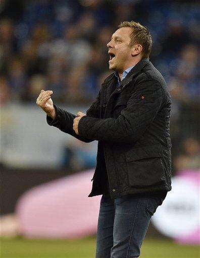 Schalke head coach Andre Breitenreiter reacts during the German Bundesliga soccer match between FC Schalke 04 and TSG Hoffenheim in Gelsenkirchen, Germany, Friday, Dec. 18, 2015. (AP Photo/Martin Meissner)