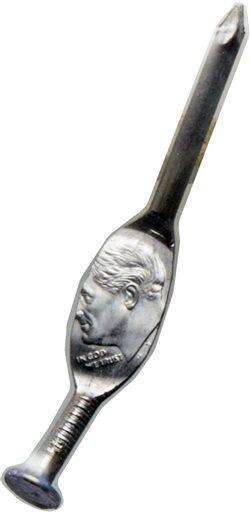 This photo provided by Heritage Auctions shows a Roosevelt Dime that was minted onto a nail. In probably one of the oddest items to come to the world of coin collecting, Heritage Auctions has announced the sale of a Roosevelt dime that was accidentally (or some say deliberately) struck onto a zinc nail. (Heritage Auctions via AP) The Associated Press