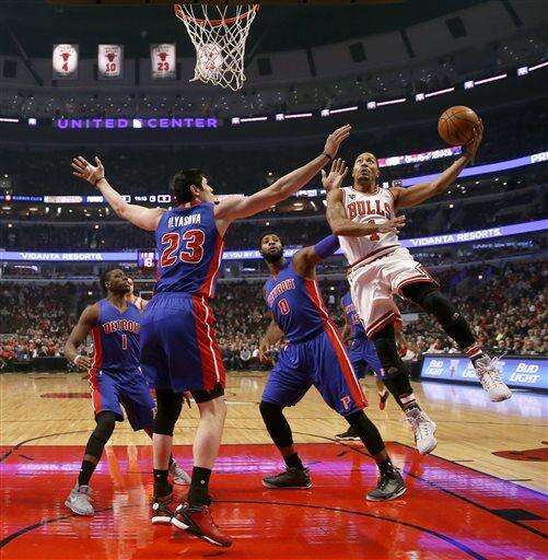 Chicago Bulls guard Derrick Rose (1) shoots as Detroit Pistons guard Reggie Jackson (1), Ersan Ilyasova (23) and Andre Drummond (0) defend during the first half of an NBA basketball game Friday, Dec. 18, 2015, in Chicago. (AP Photo/Charles Rex Arbogast) The Associated Press