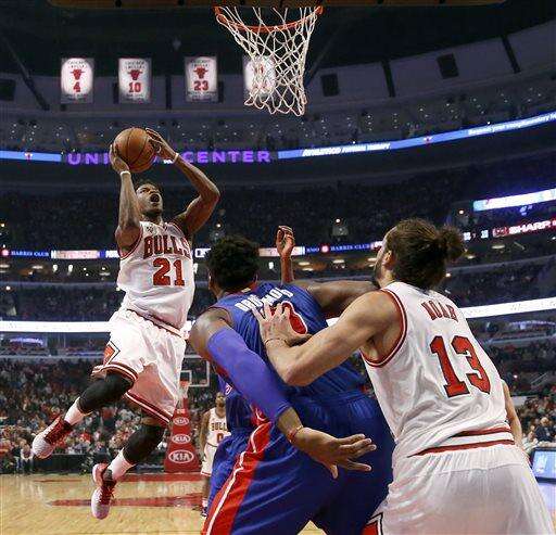 Chicago Bulls guard Jimmy Butler (21) shoots as Detroit Pistons center Andre Drummond (0) blocks out Bulls' Joakim Noah (13) during the first half of an NBA basketball game Friday, Dec. 18, 2015, in Chicago. (AP Photo/Charles Rex Arbogast) The Associated Press