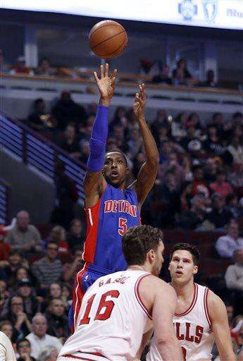 Detroit Pistons guard Kentavious Caldwell-Pope (5) shoots over Chicago Bulls center Pau Gasol (16) and Doug McDermott, right, during the first half of an NBA basketball game Friday, Dec. 18, 2015, in Chicago. (AP Photo/Charles Rex Arbogast) The Associated Press