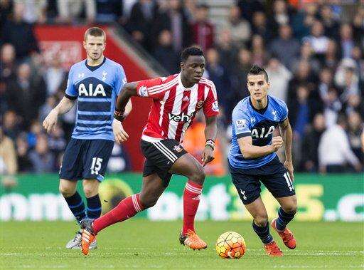 Southampton's Victor Wanyama, center, and Tottenham Hotspur's Erik Lamela, right, battle for the ball as Eric Dier looks on during the English Premier League soccer match at St Mary's, Southampton, England, Saturday Dec. 19, 2015. (Chris Ison/PA via AP) UNITED KINGDOM OUT