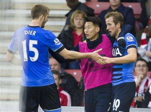 Tottenham Hotspur's Harry Kane, right, celebrates scoring against Southampton with teammates Eric Dier and substitute Son Heung-Min, center, during the English Premier League soccer match at St Mary's, Southampton, England, Saturday Dec. 19, 2015. (Chris Ison/PA via AP) UNITED KINGDOM OUT