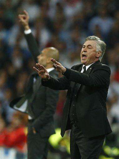 FILE - In this April 23, 2014 file picture Real's coach Carlo Ancelotti gestures to his players next to Bayern head coach Pep Guardiola, left, during a first leg semifinal Champions League soccer match between Real Madrid and Bayern Munich at the Santiago Bernabeu stadium in Madrid, Spain. Bayern Munich says Sunday Dec. 20, 2015 coach Pep Guardiola will leave the club at the end of the season and will be replaced by Carlo Ancelotti. Ancelotti, winner of three Champions League titles, signed a three-year deal. Despite the club’s willingness for him to stay on, Guardiola decided to leave after three seasons in charge. (AP Photo/Andres Kudacki) The Associated Press