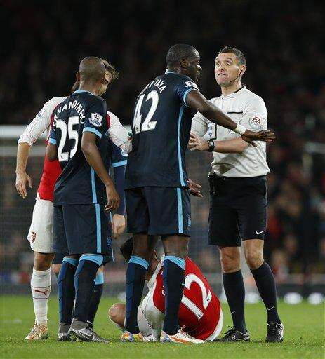 Referee Andre Marriner speaks to Manchester City's Yaya Toure, second right, after a foul was given against his team during the English Premier League soccer match between Arsenal and Manchester City at the Emirates stadium in London, Monday, Dec. 21, 2015. (AP Photo/Alastair Grant) The Associated Press