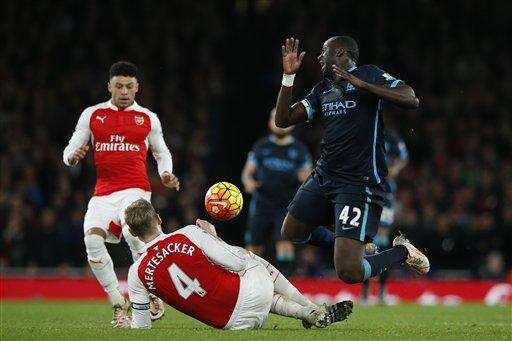 Manchester City's Yaya Toure, right, is tackled by Arsenal's Per Mertesacker, center, during the English Premier League soccer match between Arsenal and Manchester City at the Emirates stadium in London, Monday, Dec. 21, 2015. (AP Photo/Alastair Grant) The Associated Press