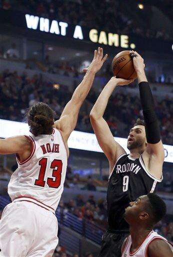Brooklyn Nets center Andrea Bargnani (9) shoots over Chicago Bulls center Joakim Noah during the first half of an NBA basketball game Monday, Dec. 21, 2015, in Chicago. (AP Photo/Charles Rex Arbogast)