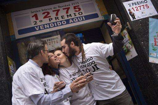 Cristina Ruiz, second left, 53, is congratulated in front of a lottery office beside other owners after selling the second Christmas lottery prize ''El Gordo''Â, in Logrono, northern Spain, Tuesday, Dec. 22, 2015. Celebrations were guaranteed Tuesday in the southern beach town of Roquetas de Mar where tickets bearing the top prize number of 79140 in Spain's Christmas lottery, "El Gordo" were sold. The number appeared on 1,600 tickets, known as âdecimosâ (tenths) with each holder winning euro400,000 ($434,800). The tickets are usually sold in many different lottery sales points making it virtually impossible to win the entire euro640 million ($696,346,000) assigned to the top prize number. (AP Photo/Alvaro Barrientos)