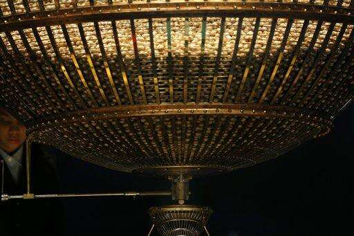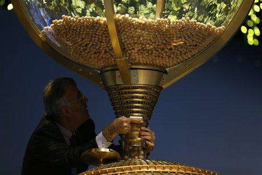 A worker opens a trap-door in a giant drum to let the balls bearing ticket numbers fall into a lower compartment before the start of Spain's Christmas lottery, in Madrid, Tuesday, Dec. 22, 2015. Celebrations were guaranteed Tuesday in the southern beach town of Roquetas de Mar, southern east Spain, where tickets bearing the top prize number of 79140 in Spain's Christmas lottery, known as "El Gordo" (The Fat One) were sold. The number appeared on 1,600 tickets, known as âdecimosâ (tenths) with each holder winning 400,000 euros ($434,800). The tickets are usually sold in many different lottery sales points making it virtually impossible to win the entire 640 million euros assigned to the top prize number. (AP Photo/Francisco Seco)