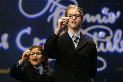 School children sing out a prized number of Spain's Christmas lottery as they hold lottery balls, in Madrid, Tuesday, Dec. 22, 2015. Celebrations were guaranteed Tuesday in the southern beach town of Roquetas de Mar where tickets bearing the top prize number of 79140 in Spain's Christmas lottery, "El Gordo" were sold. The number appeared on 1,600 tickets, known as âdecimosâ (tenths) with each holder winning euro400,000 ($434,800). The tickets are usually sold in many different lottery sales points making it virtually impossible to win the entire euro640 million ($696,346,000) assigned to the top prize number. (AP Photo/Francisco Seco)