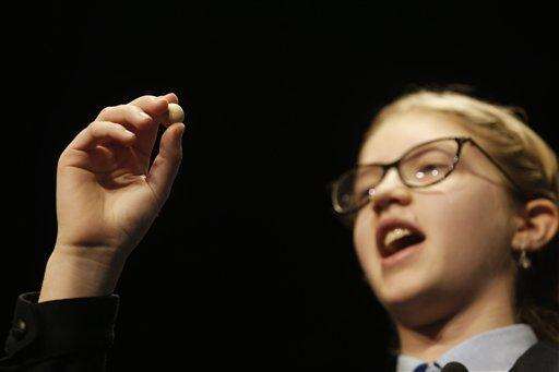 A school girl sings out the number of the top prize of Spain's Christmas lottery known as 'El Gordo' or 'The Fat One', as she holds a lottery ball, in Madrid, Tuesday, Dec. 22, 2015. Celebrations were guaranteed Tuesday in the southern beach town of Roquetas de Mar where tickets bearing the top prize number of 79140 in "El Gordo" were sold. The number appeared on 1,600 tickets, known as âdecimosâ (tenths) with each holder winning euro400,000 ($434,800). The tickets are usually sold in many different lottery sales points making it virtually impossible to win the entire euro640 million ($696,346) assigned to the top prize number. (AP Photo/Francisco Seco)