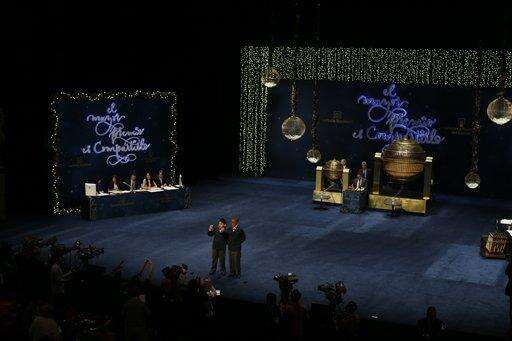 MADRID (AP) - Decked out in their school uniforms, young Spanish school children in Madrid's stately Teatro Real opera house sang out lottery numbers on live TV Tuesday for Spain's massively popular Christmas lottery that showered 2.2 billion euros ($2.4 billion) across the country.