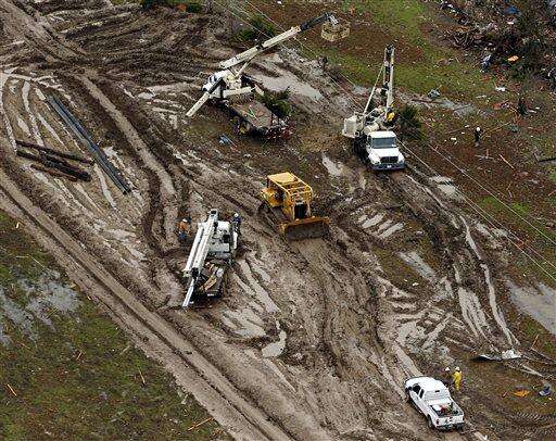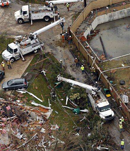 Crews work to repair lines that were damaged by a tornado, Monday, Dec. 28, 2015 in Glenn Heights, Texas. Residents surveyed the destruction from deadly tornadoes in North Texas as the same storm system brought winter woes to the Midwest on Monday, amplifying flooding that's blamed for more than a dozen deaths and prompting hundreds of flight cancellations. At least 11 people died and dozens were injured in the tornadoes that swept through the Dallas area Saturday and caused substantial damage. (G.J. McCarthy/The Dallas Morning News via AP) MANDATORY CREDIT; MAGS OUT; TV OUT; INTERNET USE BY AP MEMBERS ONLY; NO SALES