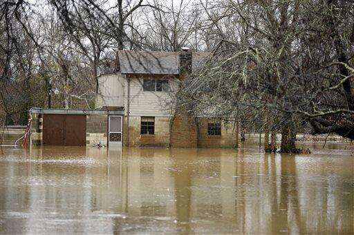 Floodwater surrounds a home Monday, Dec. 28, 2015, in Eureka, Mo. Missouri Gov. Jay Nixon has declared a state of emergency due to wide spread flooding around the state that has closed many roads after a storm system dropped more than half a foot of rain and left several dead. (AP Photo/Jeff Roberson)