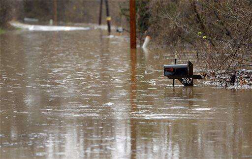 A nearly flooded mailbox sits along a flooded road Monday, Dec. 28, 2015, in Eureka, Mo. Missouri Gov. Jay Nixon has declared a state of emergency due to wide spread flooding around the state that has closed many roads after a storm system dropped more than half a foot of rain and left several dead. (AP Photo/Jeff Roberson)