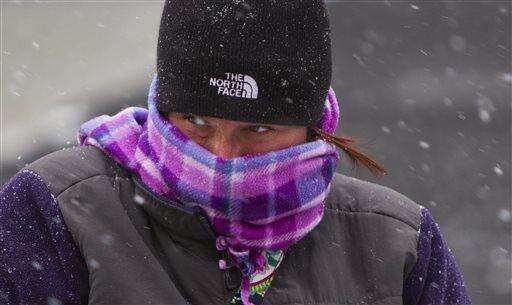 Casey Sliwa watches family members ice skate in the snow at Rosa Parks Circle in downtown Grand Rapids, Mich., Monday, Dec. 28, 2015. The winter storm is expected to produce hazardous freezing rain and sleet in Lower Michigan this afternoon and evening. Sliwa, who is from Hudsonville, said she plans to "hunker down" at home and watch movies with her family tonight. (Cory Morse/The Grand Rapids Press via AP)