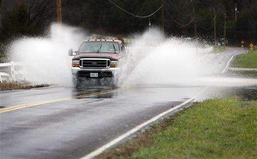 The driver of a pickup truck crosses a flooded section of road Monday, Dec. 28, 2015, in Eureka, Mo. Missouri Gov. Jay Nixon has declared a state of emergency due to wide spread flooding around the state that has closed many roads after a storm system dropped more than half a foot of rain and left several dead. (AP Photo/Jeff Roberson)