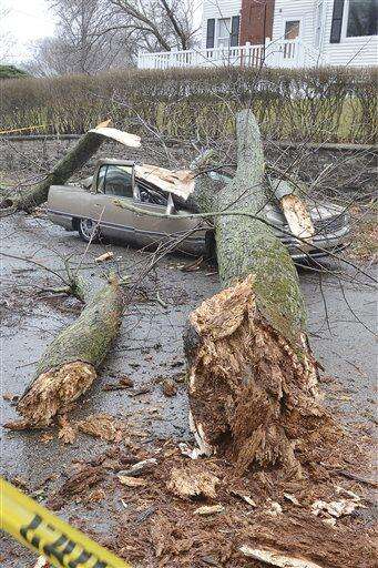 Part of a tree rests on a crushed car in Marion, Ind., after ice and high winds hit the area on Monday, Dec. 28, 2015. The storm system that spawned weekend twisters in North Texas brought winter storm woes to the Midwest on Monday and amplified flooding that's blamed for more than a dozen deaths. (Jeff Morehead/Chronicle-Tribune via AP)
