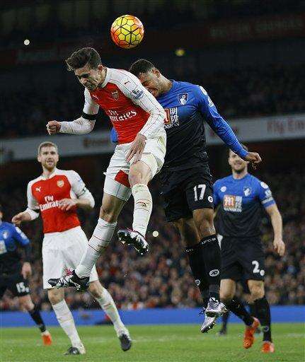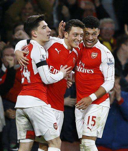 Arsenal's Mesut Ozil, centre, celebrates with Hector Bellerin, left, and Alex Oxlade-Chamberlain, right, after scoring a goal during the English Premier League soccer match between Arsenal and Bournemouth at Emirates stadium in London, Monday, Dec. 28, 2015. (AP Photo/Kirsty Wigglesworth) The Associated Press