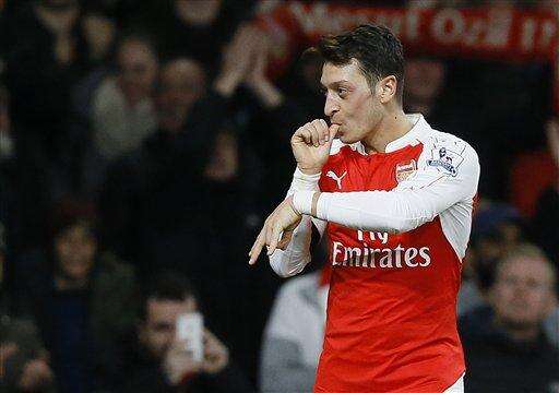 Arsenal's Mesut Ozil gestures after scoring a goal during the English Premier League soccer match between Arsenal and Bournemouth at Emirates stadium in London, Monday, Dec. 28, 2015. (AP Photo/Kirsty Wigglesworth) The Associated Press