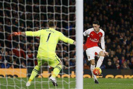 Arsenal's Mesut Ozil, right, scores a goal past Bournemouth's goalkeeper Artur Boruc during the English Premier League soccer match between Arsenal and Bournemouth at Emirates stadium in London, Monday, Dec. 28, 2015. (AP Photo/Kirsty Wigglesworth) The Associated Press