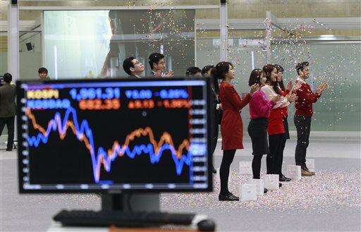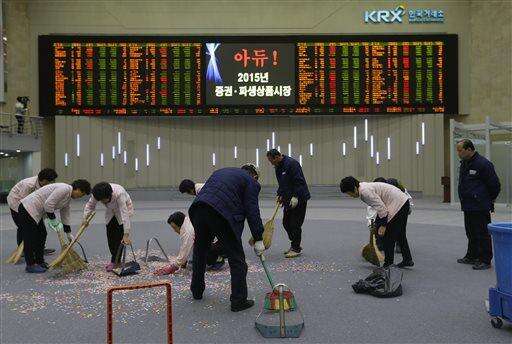 ASIA'S DAY: Earlier, investors were more upbeat, pushing Japan's benchmark Nikkei 225 up 0.3 percent to finish at 19,033.71 on its last trading day of the year. People clapped in rhythm at the Tokyo Stock Exchange in Japan's customary ceremony to close out the year. South Korea's Kospi dipped 0.3 percent to 1,961.31. Hong Kong's Hang Seng fell 0.5 percent to 21,882.15, while the Shanghai Composite added 0.3 percent to 3,572.88. Other regional shares were also mixed, rising in Indonesia but dropping in Taiwan and Singapore.