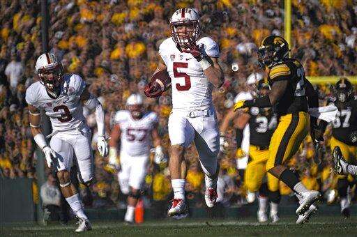 McCaffrey caught a touchdown pass on the opening snap and returned a punt 66 yards for another score while racking up 368 all-purpose yards, propelling No. 5 Stanford to a 45-16 victory over the sixth-ranked Hawkeyes on Friday.