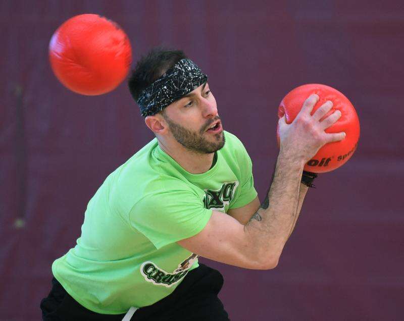 Toxic Crusader Daniel Strentz of Des Plaines deflects a ball during the Winter National Dodgeball Championships at the Schaumburg Park District Sport Center Saturday.