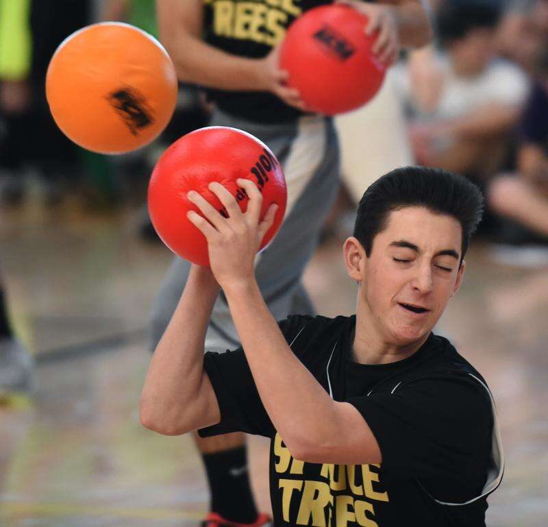 Pat Burchfield of Roselle, a Conant High School sophomore and a member of the Spruce Trees team, deflects a ball during the Winter National Dodgeball Championships at the Schaumburg Park District Sport Center Saturday.