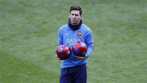 FC Barcelona's Lionel Messi holds balls during a training session at Miniestadi stadium in Barcelona, Spain, Monday, Jan. 4, 2016. (AP Photo/Manu Fernandez)