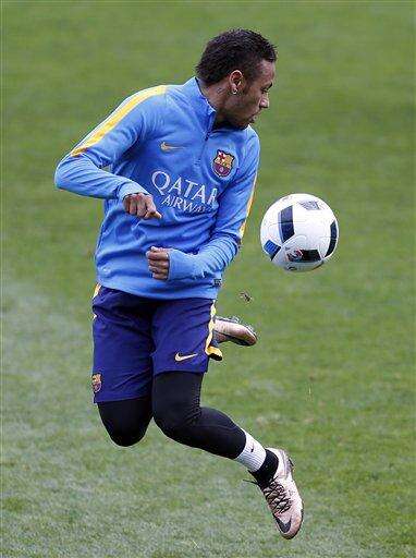 FC Barcelona's Neymar juggles with the ball during a training session at Miniestadi stadium in Barcelona, Spain, Monday, Jan. 4, 2016. (AP Photo/Manu Fernandez)