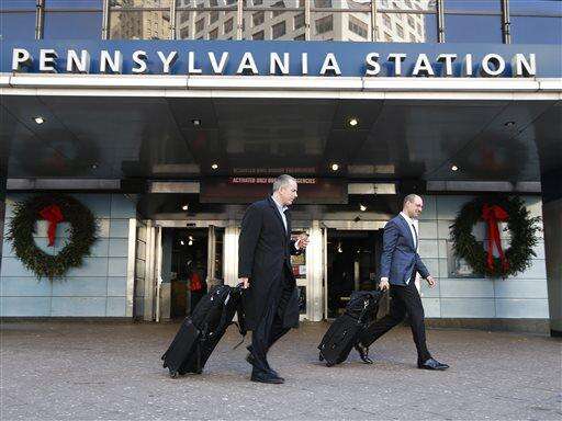 Two men roll their suitcases from the exit of Pennsylvania Station, Wednesday, Jan. 6, 2016, in New York. New York Gov. Andrew Cuomo announced a major overhaul of the transit hub during a press conference Wednesday. (AP Photo/Kathy Willens) The Associated Press