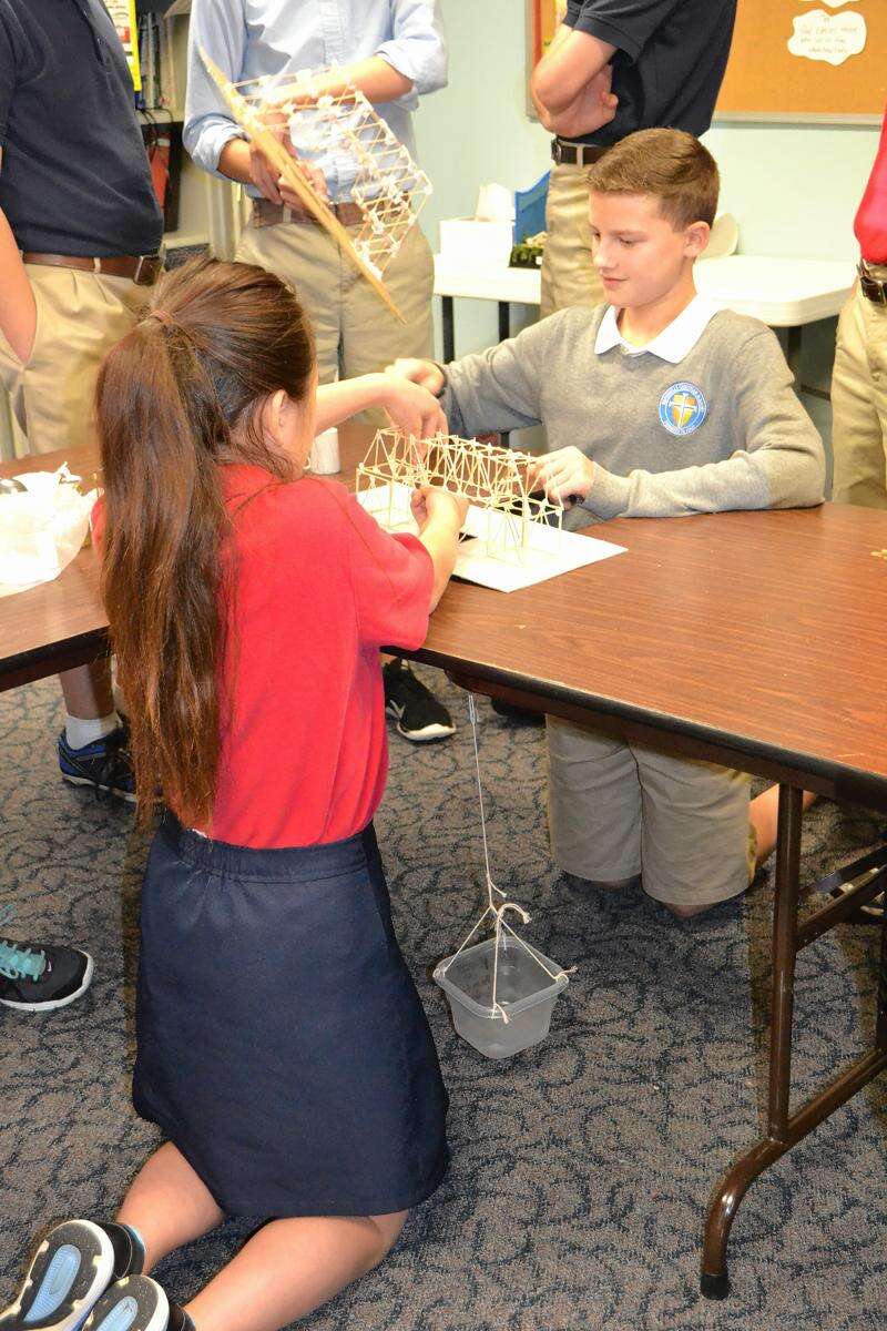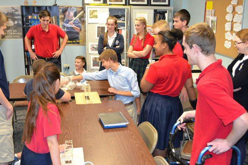 Toothpicks became bridges as ninth-graders tried to construct structures to hold as much weight as possible. Courtesy of Naperville Christian Academy