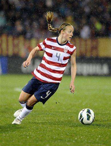 FILE - In this Oct. 12, 2012, file photo, United States' Becky Sauerbrunn dribbles the ball during an international friendly soccer match against Germany in East Hartford, Conn.Midfielder Carli Lloyd and Sauerbrunn have been chosen captains of the U.S. Women's National Team. (AP Photo/Fred Beckham, File) The Associated Press
