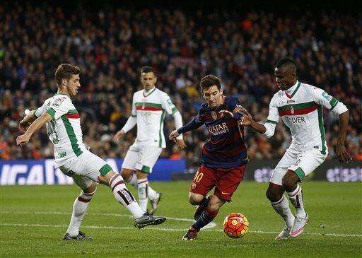 Messi found the net from close range in the eighth minute after a pass from Arda Turan, then bagged his second six minutes later by striking an open net after a pass by Suarez. Messi's third goal came after Neymar struck the post and the ball rebounded to Messi inside the area for his ninth league goal.