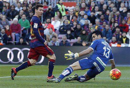 FC Barcelona's Lionel Messi, left, scores past Granada's goalkeeper Andres Fernandez during a Spanish La Liga soccer match between Barcelona and Grenada, at the Camp Nou stadium in Barcelona, Spain, Saturday, Jan. 9, 2016. (AP Photo/Manu Fernandez) The Associated Press