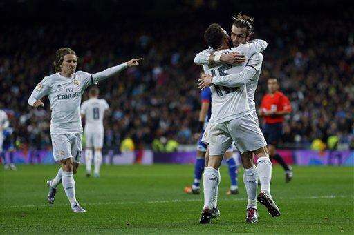 Real Madrid's Gareth Bale, right, celebrates with teammate Daniel Carvajal, second right, after scoring their side's second goal against Deportivo Coruna during a Spanish La Liga soccer match between Real Madrid and Deportivo Coruna at the Santiago Bernabeu stadium in Madrid, Saturday, Jan. 9, 2016. (AP Photo/Francisco Seco) The Associated Press