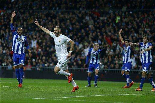 Real Madrid's Karim Benzema, second left, celebrates after scoring the opening goal against Deportivo Coruna during a Spanish La Liga soccer match between Real Madrid and Deportivo Coruna at the Santiago Bernabeu stadium in Madrid, Saturday, Jan. 9, 2016. (AP Photo/Francisco Seco) The Associated Press