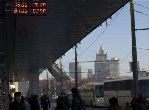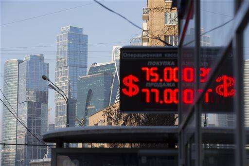 Sign showing the currency exchange rates of the Russian ruble, U.S. dollar is seen with the skyscrapers of the "Moscow City" in the background in Moscow, Russia, Monday, Jan. 11, 2016. The Russian ruble has tanked on the first day of trading after a ten-day holiday period as the price of oil continues to decline. The national currency dropped by nearly 2 percent half an hour into trading to 76.1 rubles on Monday at the Moscow stock exchange's first currency trading session since Dec. 31. (AP Photo/Alexander Zemlianichenko) The Associated Press