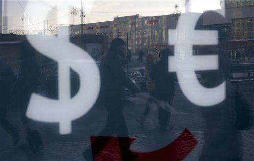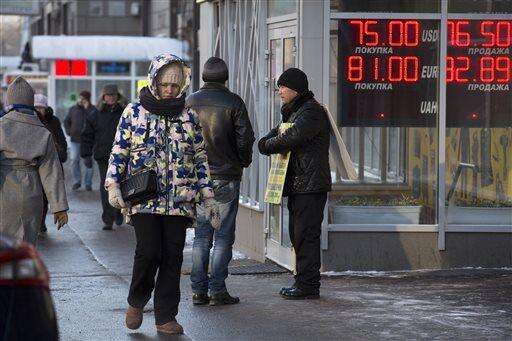 People walk along a street passing an exchange booth in downtown Moscow, Russia, on Monday, Jan. 11, 2016. The Russian ruble has tanked on the first day of trading after a ten-day holiday period as the price of oil continues to decline. The national currency dropped by nearly 2 percent half an hour into trading to 76.1 rubles on Monday at the Moscow stock exchange's first currency trading session since Dec. 31. (AP Photo/Ivan Sekretarev) The Associated Press