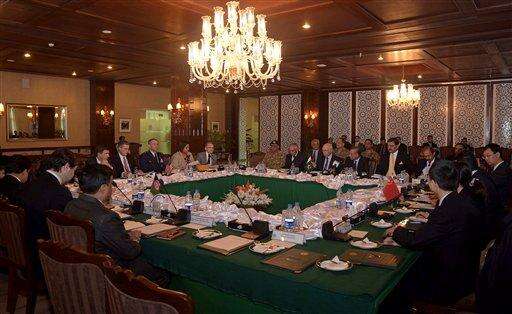 In this photo released by Associated Press of Pakistan, delegates from Pakistan, Afghanistan, China and United States attend a meeting hoping to lay the roadmap for peace talks with the Taliban, at the foreign ministry in Islamabad, Pakistan, Monday, Jan. 11, 2016. The meeting comes as battlefield losses in Afghanistan are mounting and entire swaths of the country that cost hundreds of U.S.-led coalition and Afghan military lives to secure slip back into Taliban hands. Taliban representatives have not been invited to the talks. (Associated Press of Pakistan via AP) The Associated Press