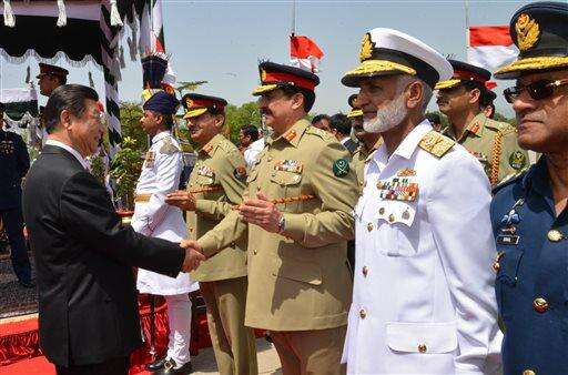 FILE - In this April 20, 2015, file photo provided by Pakistan's Press Information Department, Chinese President Xi Jinping, left, shakes hands with Pakistan's army chief Gen. Raheel Sharif, at Nur Khan airbase in Islamabad, Pakistan. Pakistan, Afghanistan, China and the United States are meeting Monday, Jan. 11, 2016, in the Pakistani capital of Islamabad to craft out a roadmap for peace to end an increasingly bloody and protracted Afghan war. But warring sides are miles apart, say analysts and protagonists. The Taliban are not invited to Monday’s talks. (Press Information Department via AP, File) The Associated Press