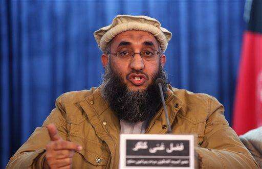 FILE - In this Saturday, Jan. 9, 2016, file photo, Fazil Ghani Kakar, a member of the Afghan People's Dialogue on Peace Initiative, addresses a news conference in Kabul, Afghanistan. Pakistan, Afghanistan, China and the United States are meeting Monday, Jan. 11, 2016, in the Pakistani capital of Islamabad to craft out a roadmap for peace to end an increasingly bloody and protracted Afghan war. But warring sides are miles apart, say analysts and protagonists. The Taliban are not invited to Monday’s talks. (AP Photo/Rahmat Gul, File) The Associated Press