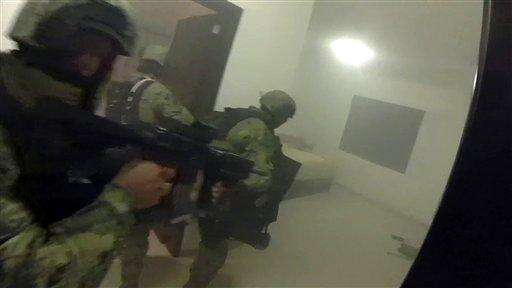 This frame-grab taken from Jan. 8, 2016 video released by Mexico's presidential press office, shows Mexican navy marines storming a home during the operation to recapture Mexico's most wanted drug kingpin, Joaquin "El Chapo Guzman" Guzman in Los Mochis, Mexico. Mexico has begun the process of extraditing Guzman to the United States, where he faces drug-trafficking charges, but that could take "a year or longer" because of legal challenges, said the head of Mexico's extradition office, Manuel Merino. He cited one extradition case that took six years. (Mexico's presidential press office via AP) The Associated Press