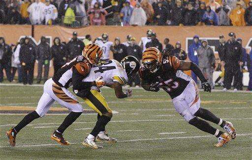 Cincinnati Bengals' Vontaze Burfict (55) runs into Pittsburgh Steelers' Antonio Brown (84) during the second half of an NFL wild-card playoff football game Sunday, Jan. 10, 2016, in Cincinnati. Pittsburgh won 18-16. Burfict was called for a penalty on the play. (AP Photo/John Minchillo) The Associated Press